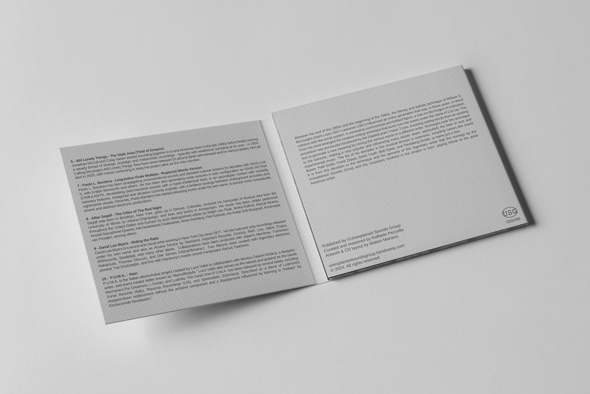 From the always fantastic imprint, Unexplained Sounds Group known for its rigorous efforts exploring some of the most obscure corners of experimental sound practice comes “Cut UP. Deconstructing W. S. Burroughs”, an astounding new collection exploring contemporary practices rooted in avant-garde tactic - the“cut up”- developed and advocated by the legendary Beat writer William S. Burroughs.
